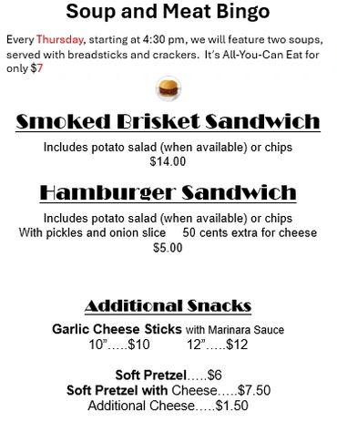 Check out our food menu that features our delicious 10' or 12' pizza or flatbread pizza. We also have some snacks and our popular smoked brisket sandwich and Hamburgers. Come to eat in a nice small town atmosphere!